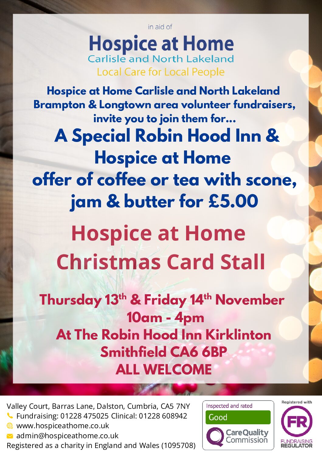 A Special Robin Hood Inn & Hospice at Home offer of coffee or tea with scone, jam & butter for £5.00